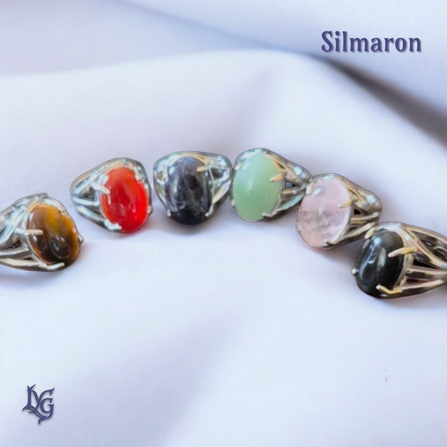 SILMARON est une bague artisanale de type bague griffe, réalisée en laiton argenté, sertie d’un cabochon de pierre fine. La pierre est choisie selon les disponibilités, ce qui rend chaque création unique, tout en conservant le même modèle et la même monture.