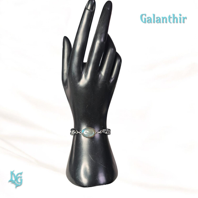 Le bracelet Galanthir est un bijou élégant et protecteur, pensé comme un talisman d’équilibre et d’intuition. Il associe des perles d’hématite de 4 mm, tressées avec soin en cuivre argenté sur base d’acier inoxydable, à un cabochon de labradorite (18 × 13 mm) aux reflets profonds et changeants.