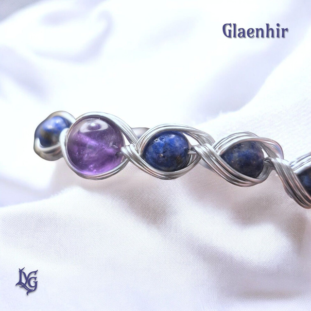 Le bracelet GLAENHIR est une création artisanale réalisée sur une base en acier inoxydable, assurant solidité et confort au quotidien. Il est orné d’un tressage en cuivre argenté, façonné et ajusté à la main, qui entoure délicatement des perles naturelles d’améthyste et de lapis-lazuli.